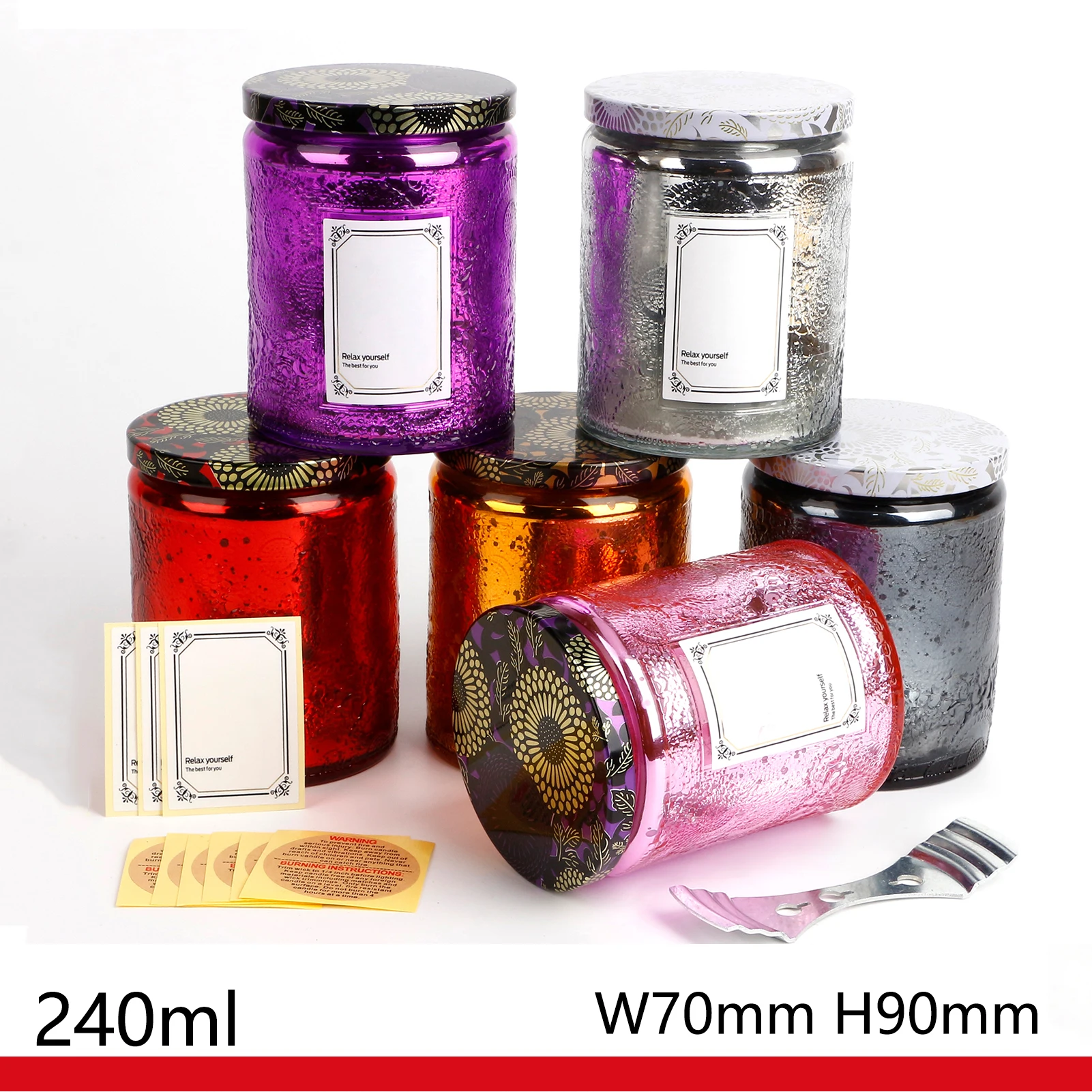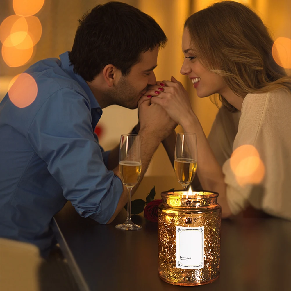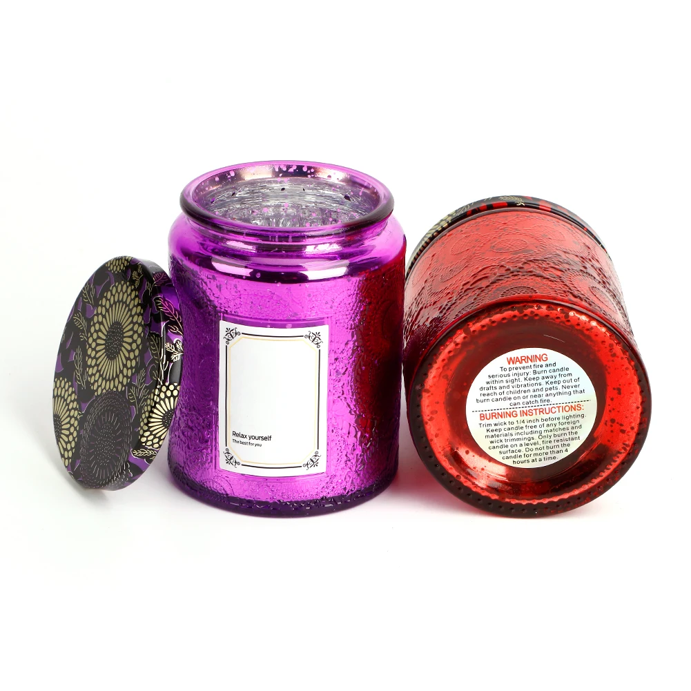 MOSS TEMPLE Embossed Blinking Glass Candle Container Electroplated Shining Jar with Lids and Candle Warning Label for Candle Making